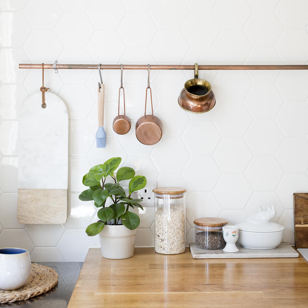 Металлические акценты — особенно медные — добавят тепла в минималистичную белую цветовую гамму кухни. При работе с ограниченной цветовой гаммой экспериментируйте с текстурами, формами и отделкой. Вы получите дополнительные баллы за стиль, если приобретете медные кастрюли — практичные и красивые.