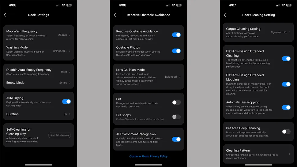 Выбор маршрута влияет на время автономной работы, и приложение предупреждает об изменениях навигации. Тем не менее предпочитаю стандартный маршрут для уборки пылью и углубленный для влажной уборки, поскольку они дают лучшие результаты.